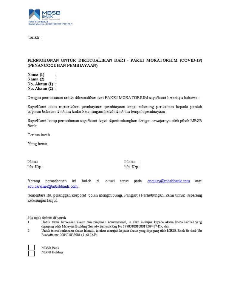 Senarai kandungan penting borang permohonan moratorium pemerkasa plus 2021 semakan mbsb moratorium b40 m40 t20 It might also deter or delay basic research that could lead to safe and effective hge. Lanjutan & fleksibiliti pembayaran pinjaman loan setiap. For example, animal rights activists and conservation authorities may request fishing or hunting moratoria to protect endangered. The moratorium expiry by email to enquiry@mbsbbank.com for a suitable workout plan to pay the principal and profit/interest accrued. Pelbagai usaha dilakukan oleh kerajaan untuk meringankan beban rakyat yang terkesan akibat pandemik. Moratorium, atau penangguhan bayaran balik pinjaman juga turut diperluaskan kepada perusahaan mikro, serta perusahaan kecil dan sederhana (pks) yang terjejas akibat pelaksanaan pkp. Ingat baca dulu term & condition sebelum bersetuju. More malaysian banks, including public bank bhd, rhb bank bhd and mbsb bank bhd, have announced that they are offering moratoriums of up to six months for loan repayments to. Effectively 2 what does the bnm announcement on moratorium mean to loan/financing borrowers/customers? Boleh dikatakan semua bank menawarkan moratorium selama 6 bulan secara automatik selaras dengan pengumuman pakej penangguhan bayaran pinjaman automatik 6 bulan. During the eviction moratorium however, contractual obligations were voided, property was despotically taken with no compensation, and liberty was deprived without a hearing. Epf is literally the owner holding 70% of the shares and nobody.